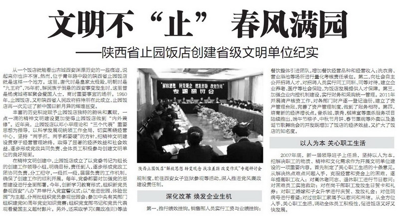 《西安日報》記者方斌峰在對止園飯店的采訪中,對飯店的創建省級文明單位活動進行了報道。2011年10月21日《西安日報》第四版刊登止園飯店創建省級文明單位的紀實。
