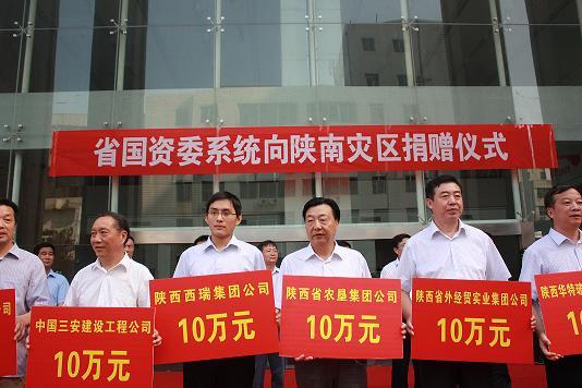 陜南災區群眾的情況深深的牽動著陜西省外經貿實業集團全體員工的心,8月4日早上,省國資委系統國有企業向陜南災區捐款儀式在省國資委大樓前隆重舉行,副省長姚引良、省國資委黨委書記白阿瑩出席了儀式。陜西省外經貿實業集團李鳳成副總經理代表集團公司向陜南災區捐款10萬元,以實際行動支持陜南災后恢復重建和突破發展工作。