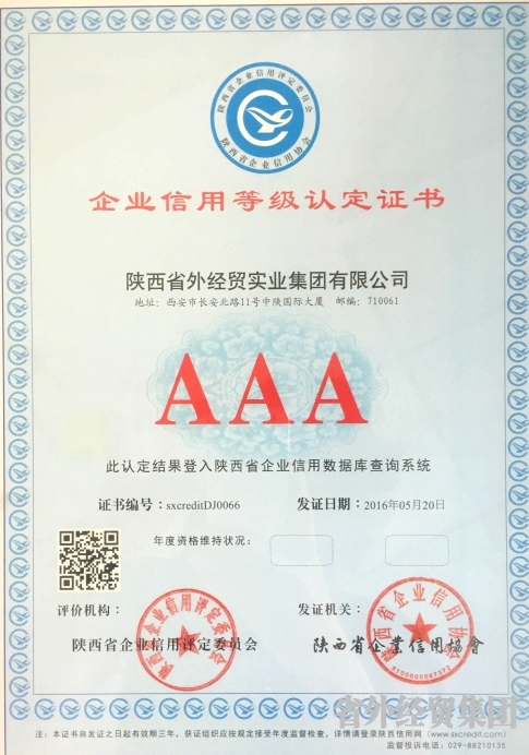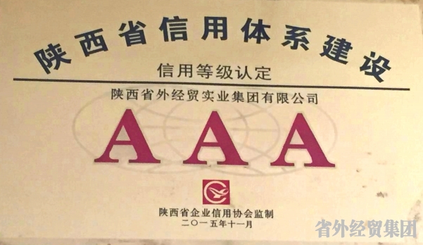 5月20日,省外經(jīng)貿(mào)集團(tuán)成功通過陜西省企業(yè)信用協(xié)會和陜西省企業(yè)信用評定委員會的綜合信用等級評價,榮獲陜西省3A級綜合信用企業(yè)的稱號。