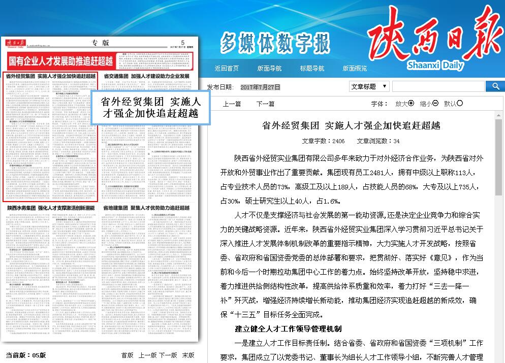 7月27日集團公司黨委書記肖玉龍同志在《陜西日報》第五版發(fā)表了題為《省外經(jīng)貿(mào)集團 實施人才強企加快追趕超越》的文章,提出了集團公司深化人才發(fā)展體制機制改革的總體思路和工作要求,思想性、指導(dǎo)性、針對性都很強,對加快實施人才強企戰(zhàn)略,深入推進人才發(fā)展體制機制改革,推動集團公司實現(xiàn)創(chuàng)新驅(qū)動和轉(zhuǎn)型發(fā)展具有重要的指導(dǎo)意義。請集團公司各黨組織及時組織學(xué)習(xí),認真貫徹落實,加快形成有利于人才創(chuàng)新創(chuàng)業(yè)的制度環(huán)境,為實現(xiàn)追趕超越目標(biāo)提供有力支撐。
