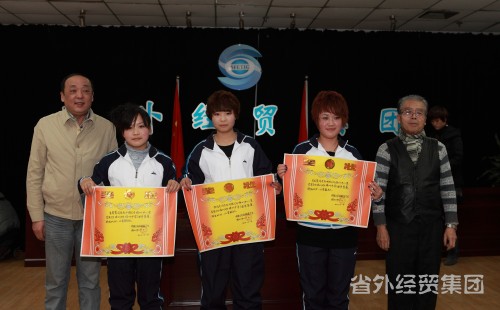 集團公司總經理趙彬(左一)為獲獎實習生頒發證書